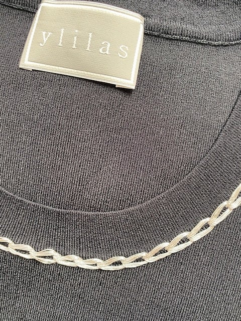 Uネックの襟ぐりに、薄いゴールド糸でチェーンステッチを施しています。