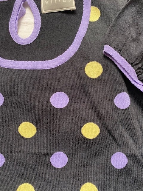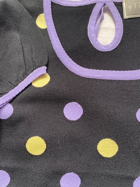 黒地にパープルとイエローの水玉インターシャのトップスです。