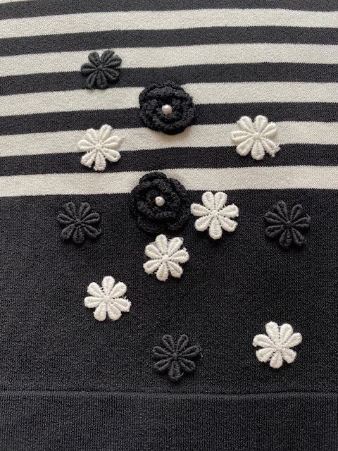 ボーダーにレース花とかぎ針フラワーを飾ったセーター。